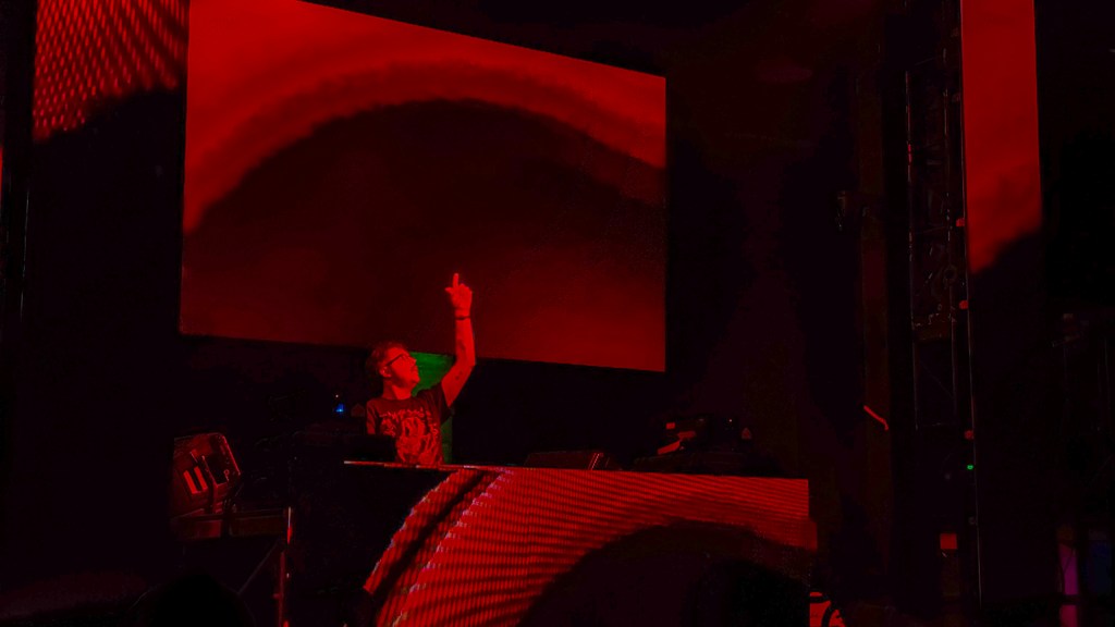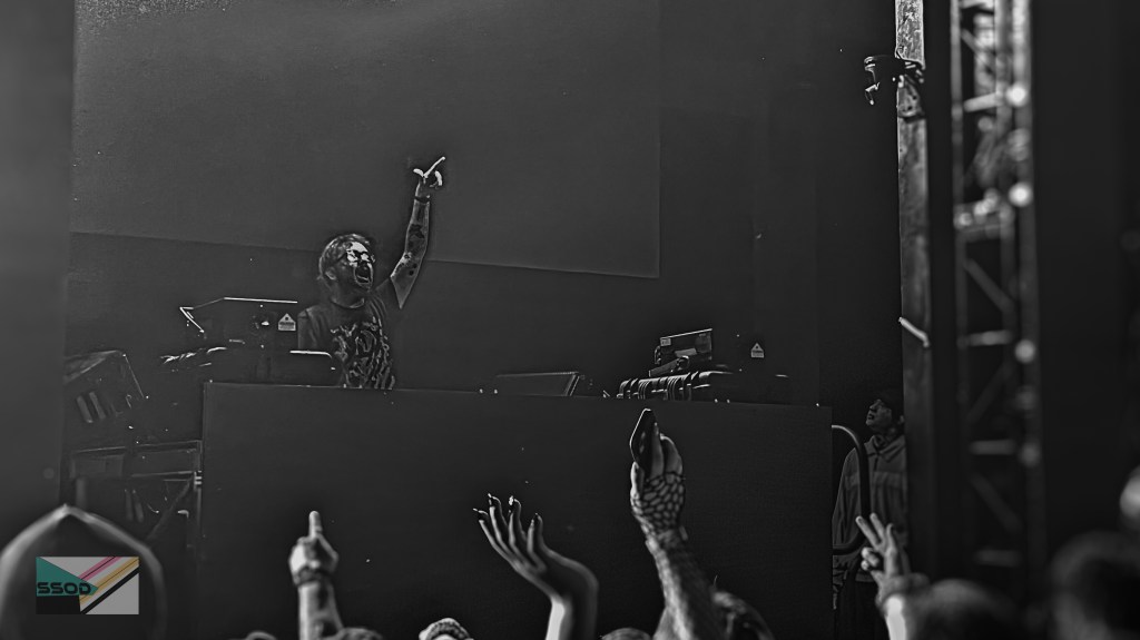 Hi I’m Ghost’s setlist wasn’t the only entertainment for the 200-ticket buying audience, when not stomping out another riddim heavy metal bass drop, two big screen LED panels continuously flashed motion graphic effects, rotating a mix of ghost sketches and other signature logo designs, when not juxtaposition or scaling in shape designs.